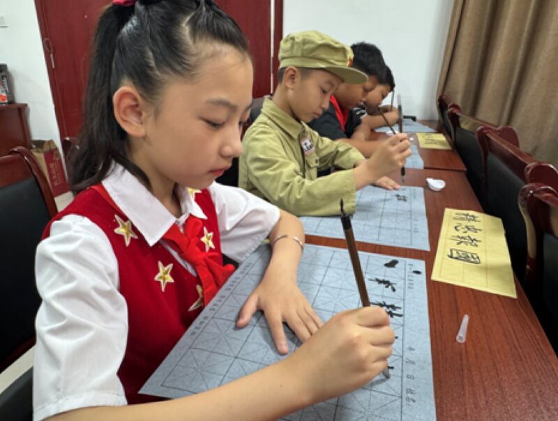 現(xiàn)場,退役軍人家長化身為“教官”,細(xì)心指導(dǎo)孩子們學(xué)習(xí)敬軍禮、站軍姿,每一個規(guī)范的舉止都映射出孩子們對軍人形象的憧憬。在愛國故事分享環(huán)節(jié),戰(zhàn)斗英雄楊根思的英勇故事以及“精忠報國”的典故,讓孩子們對愛國情懷與責(zé)任擔(dān)當(dāng)有了更加生動的認(rèn)識。書法教師親自示范,教導(dǎo)孩子們書寫“精忠報國”四字,孩子們在筆墨之間領(lǐng)悟到了沉甸甸的責(zé)任感;在彩泥軍事模型創(chuàng)作環(huán)節(jié),大家發(fā)揮創(chuàng)意,用手中的彩泥描繪出心中的軍營景象。最后,孩子們莊嚴(yán)宣誓,稚嫩的聲音中充滿了“勤奮學(xué)習(xí)、報效祖國”的決心。