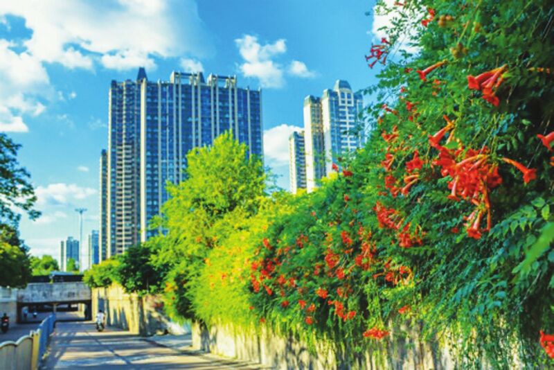 當下,我市淮河大道立交橋東側的南北下沉式非機動車過道旁,長約30米的墻壁上開滿了凌霄花,形成一道美麗的花墻。火紅的花朵在烈日下熱情綻放,花開如瀑,花藤隨風搖曳,成為酷暑盛夏一抹亮麗的風景。