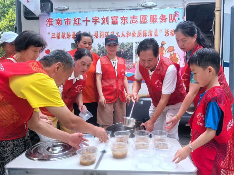 據(jù)介紹,今夏持續(xù)高溫,市紅十字會多支志愿服務(wù)隊(duì)接力開展送清涼活動。長期關(guān)愛環(huán)衛(wèi)工的市紅十字會劉富東志愿服務(wù)隊(duì)隊(duì)長、“淮南好人”劉富東,多年來堅(jiān)持“冬送溫暖,夏送清涼”。此次,他再次個人出資5000元,采購紅棗、銀耳、米酒、雪梨熬煮清涼粥并添置毛巾、肥皂、口罩,還頂著高溫專程前往梨園,采購清甜多汁的丑梨,將物資分裝成一份份飽含心意的“愛心清涼包”。