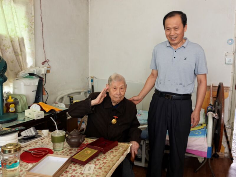 (記者 柏雪)近日,八公山區工會慰問組赴上海楊浦區看望百歲抗戰老兵葉有余。當“中國人民抗日戰爭勝利80周年紀念章”佩戴在老人胸前時,這位百歲老人顫抖著挺直佝僂的脊背,敬上一個標準軍禮,淚光映著徽章,也映著80年的烽火記憶與家國深情。