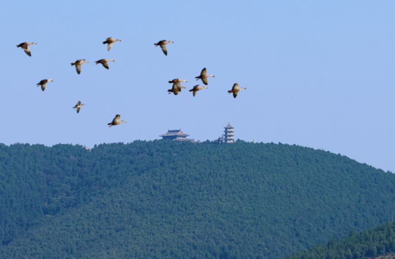 時至秋分,天氣漸涼,又到了候鳥遷徙季節。日前,首批鴛鴦小分隊已抵達大通區鴛鴦湖,天鵝將于10月中旬來淮越冬。圖為一群國家二級保護動物白眉鴨飛越八公山。