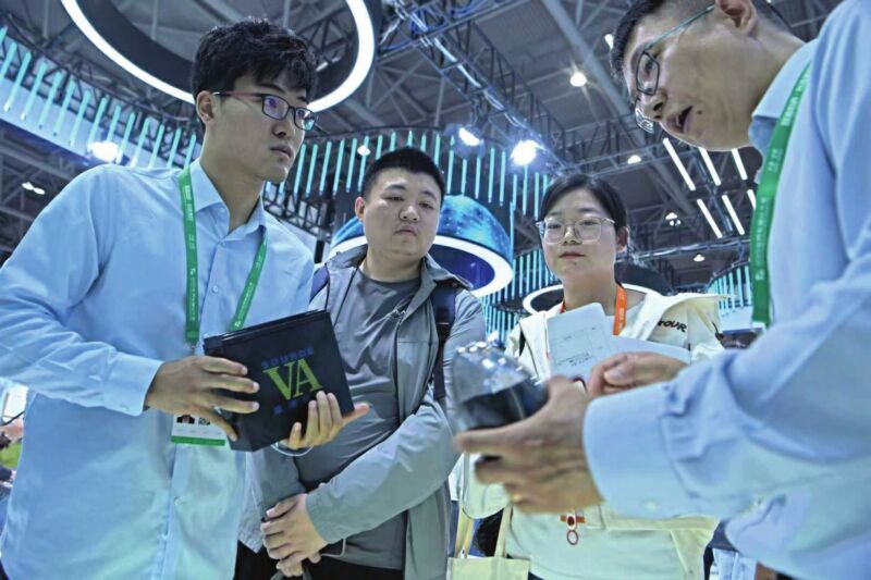 圖一:2025世界制造業(yè)大會(huì)現(xiàn)場(chǎng),觀眾了解淮南益恒科技有限公司展出的電池產(chǎn)品。