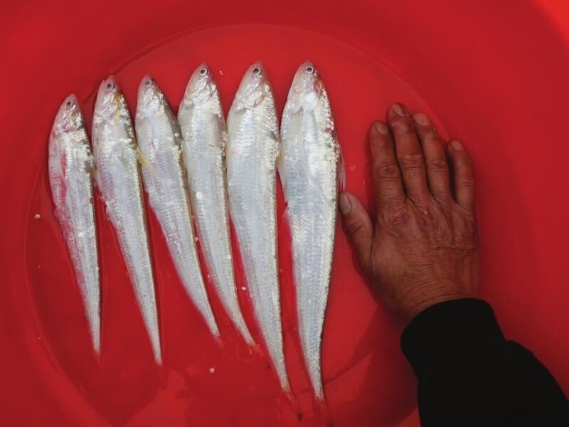 大眾熟知的“高價(jià)刀魚”多為“江刀”,即每年清明前后從大海洄游至長(zhǎng)江的刀鱭;洄游途中因路線受阻、定居于河流湖泊的則成為“河刀”“湖刀”;茨媳镜厥袌(chǎng)常見(jiàn)的瓦埠湖“毛刀魚”,便是經(jīng)濟(jì)型“湖刀”,體型較小,通常曬成魚干保存。當(dāng)?shù)鼐用裣矏?ài)將其用辣椒爆炒后加水慢熬,搭配貼餅食用,鮮香入味,是極具地方特色的美食。