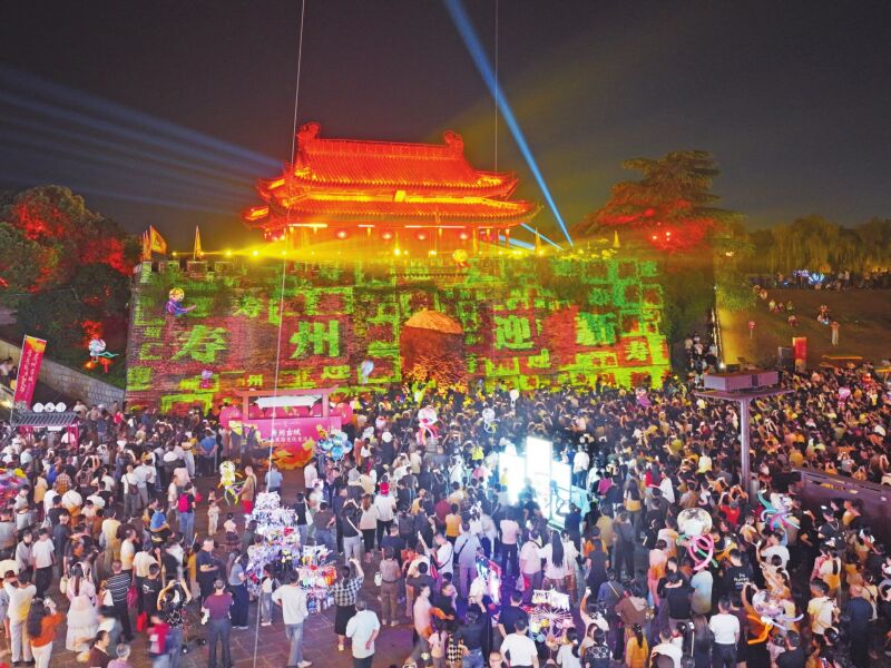 國慶中秋假期,壽縣古城文旅活動精彩紛呈。10月7日晚,壽縣賓陽門古城墻光影秀璀璨亮相,楚文化故事如畫卷般鋪展于宋代城磚之上,楚風紋樣在燈光映襯下靈動流轉,以沉浸式的體驗方式,揭開“一城人文典故,千年魅力楚都”的浪漫篇章。