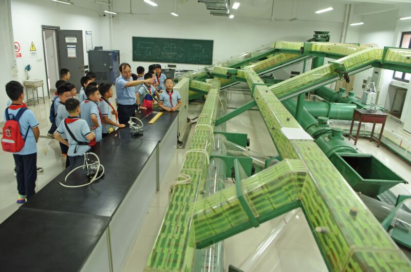 國慶假期,田家庵區第十八小學組織學生走進安徽理工大學實驗室,通過科學課、科學實驗及游戲互動,感受科學魅力。圖為學生在安徽理工大學實驗室,了解煤礦智能通風系統工作原理。