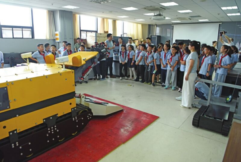 (記者 付莉榮)“太神奇了,這個機器的頭部頂端像個狼牙棒,通過遠程操作,在井下可以進行無人智能采煤,提高了工作效率,也保障了人員安全。”10月8日上午,安徽理工大學深部煤礦采動響應與災害防控國家重點實驗室里傳來陣陣驚嘆。田家庵區第十八小學組織社會實踐活動走進高校,同學們近距離體驗操作井下智能掘進機設備,并通過科學課、興趣實驗、游戲互動,真切感受科學魅力。