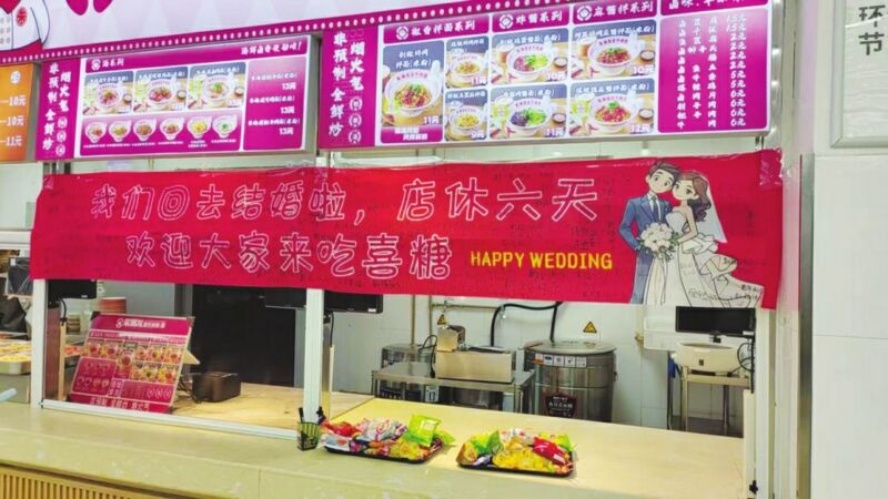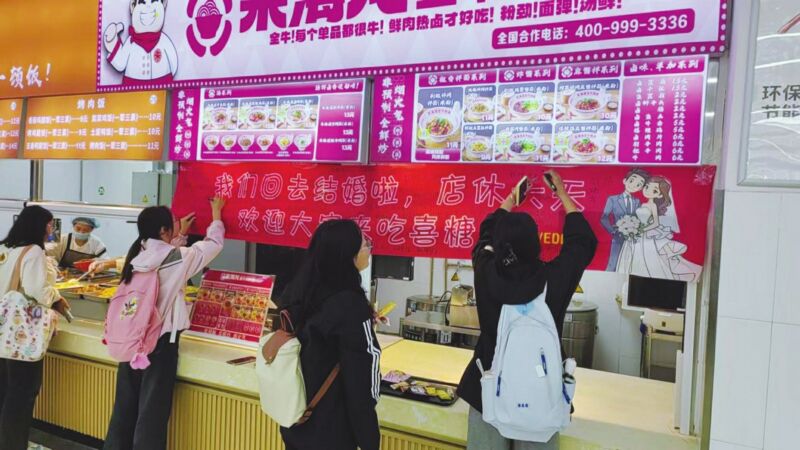 高校食堂一檔口老板“橫幅請假”辦喜事引爆學子祝福成詩