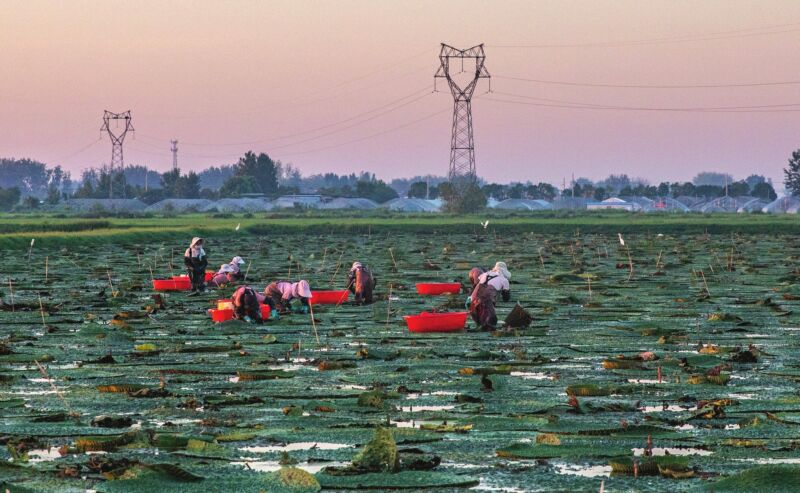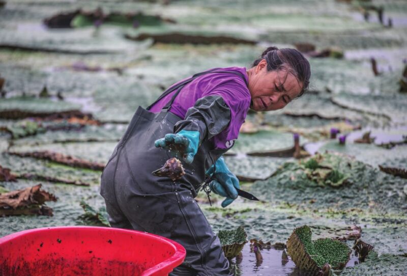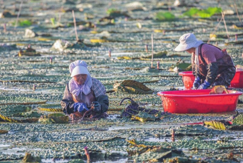 金秋時節,大通區王樓村的百畝芡實迎來采收季。村民們彎腰俯身,熟練地采摘著渾圓飽滿的芡實果實,水面映著忙碌的身影,一派豐收景象。