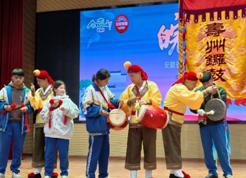 演出現(xiàn)場,淮南文旅推薦官楚小南與師生們的熱情互動(dòng)瞬間點(diǎn)燃了全場氣氛。在主持人的帶領(lǐng)下,全場齊聲高唱《國家》,激昂的歌聲抒發(fā)了對祖國的熱愛;省級非遺壽州鑼鼓《喜鵲登枝》的表演則成為整場演出的亮點(diǎn)。高二學(xué)生玉蘇普江·納斯?fàn)柦蛶孜煌瑢W(xué)自告奮勇登臺(tái),在傳承人手把手指導(dǎo)下學(xué)習(xí)鑼鼓技藝,他興奮地稱,“壽州鑼鼓的節(jié)奏感很特別,這種需要團(tuán)隊(duì)協(xié)作的表演形式很有感染力。”