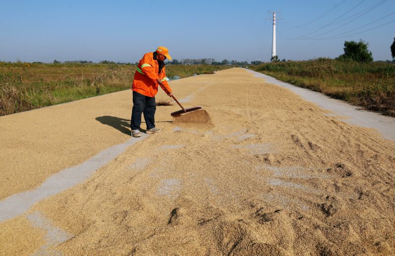 10月23日,淮南經開區種糧大戶胡德月將已收獲上來的30萬斤稻谷,在洛河灣地封閉路段進行攤曬。連日秋雨過后,我市農民抓住當前晴好天氣,采取多種方式,抓緊搶收搶烘搶曬糧食。