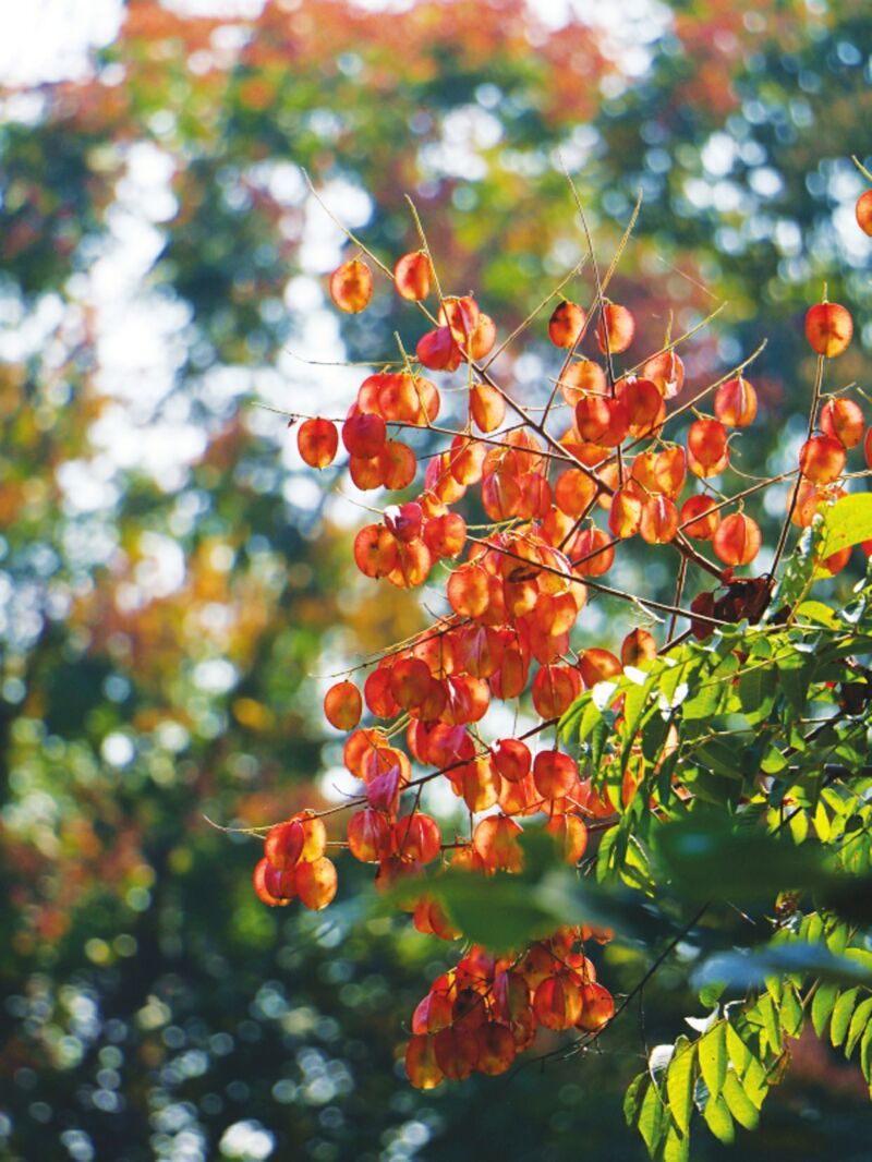 欒樹是被譽為“秋日之韻”的植物,夏秋時開出稠密的黃花,花串褪去后,便結出小燈籠般的蒴果。隨著季節輪轉,蒴果色彩也逐漸變化,直至橘紅。欒樹蒴果成熟后,有的會掉落,風吹滾動,像小鈴鐺般沙沙作響。若細心剝開一個蒴果,便會發現其內部藏匿著幾顆黑色的小圓粒,便是它的果實,是可以出芽繁殖的,也有人用它來做佛珠或手串。