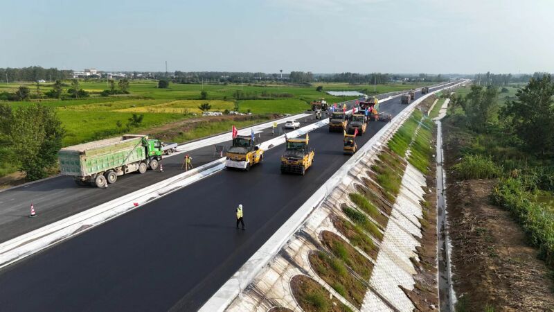 受汛期強降雨影響,項目建設工期壓力巨大。為此,項目部提前設置臨時排水溝、布置集水井等針對性措施,確保防雨篷布等物資就近儲備,建立氣象預警聯(lián)動機制,保障施工質量和作業(yè)連續(xù)性。同時,搶抓晴好天氣“窗口期”,先后投入全斷面瀝青攤鋪機、雙鋼輪壓路機及膠輪壓路機等大型作業(yè)設備10余臺套協(xié)同作業(yè),配備作業(yè)工人120余名,創(chuàng)造單日瀝青攤鋪里程突破3千米的“淮桐速度”。