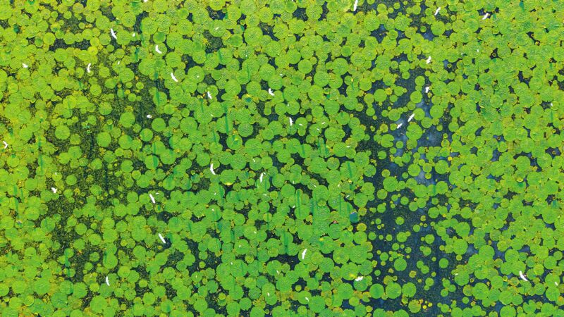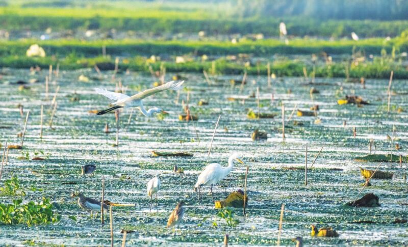 近日,大通區王樓村芡實迎來豐收,河塘中散落著采收后殘留的芡實,潔白的白鷺被這天然“餌料”吸引,紛紛駐足塘中。時而飛翔尋覓,時而俯身啄食,嬉戲玩鬧,翩躚起舞,構成一幅豐收與生態共生的鮮活畫卷。