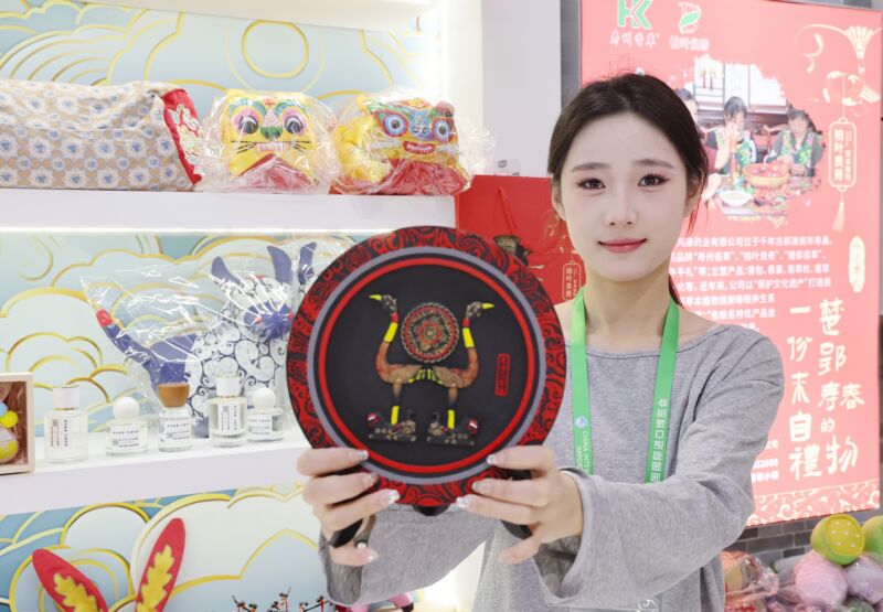 11月5日,第八屆中國國際進(jìn)口博覽會在上海開幕。我市11家企業(yè)攜特色產(chǎn)品集中亮相國家會展中心(上海)“安徽淮南”展館,讓中外觀眾領(lǐng)略淮南老字號、非遺代表作和地理標(biāo)志產(chǎn)品的獨特魅力。圖為工作人員在壽州香草展臺展示一款極具楚風(fēng)漢韻的文創(chuàng)產(chǎn)品。