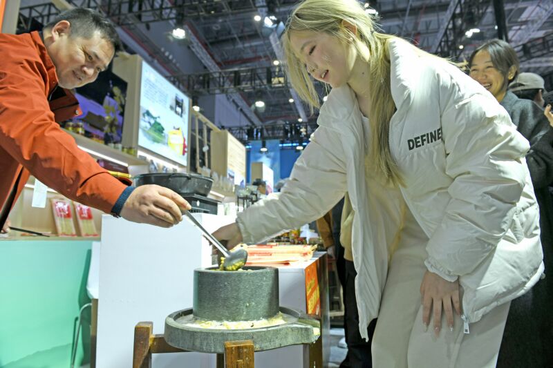 觀眾在安徽八公山豆制品有限公司展位體驗(yàn)傳統(tǒng)豆腐制作技藝。