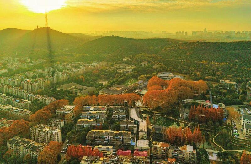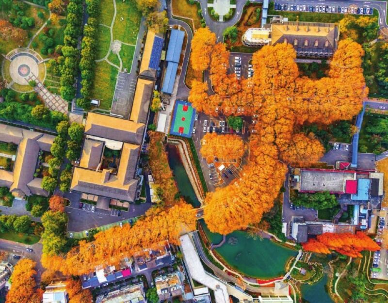 冬意漸濃,舜耕山腳下的法國梧桐身披金甲,如霞光鋪道。高空俯瞰,連綿樹冠勾勒出奇特的側影,靜臥在山腳下,構成一幅靜謐而磅礴的冬日畫卷。