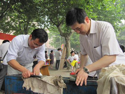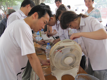 田家庵電廠里所有的黨員們為了迎接“七·一”的到來,選擇這一天在小區里為廣大居民進行便民服務,所有的服務都是針對老百姓生活的。整條馬路上全是按照不同性質的服務進行分類的服務點,有的補鍋,有的修電器,有的磨刀,有的刷飲水機,每一個服務點都忙得不亦樂乎,而被服務的居民們都開心地說:“這種便民服務真是貼心,家里小物品大電器都拿過來的給修好了,太方便了!”