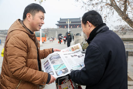 圖一:壽縣古城南門口,淮南日報發(fā)行人員向市民派送報紙。