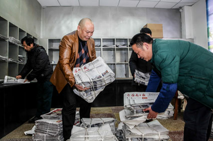 圖二:1月6日上午,中國郵政集團(tuán)公司壽縣分公司工作人員在分揀當(dāng)日的《淮南日報》、《淮河早報》。