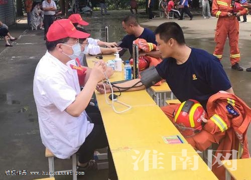 從7月17日開始,毛集實驗區(qū)普降大到暴雨。汛情發(fā)生后,消防救援局南京訓練總隊的指戰(zhàn)員迅速馳援淮南,承擔起固堤、疏散轉(zhuǎn)移群眾等任務。在安置點,來自安徽理工大學第一附屬醫(yī)院(淮南市第一人民醫(yī)院)的醫(yī)生為消防指戰(zhàn)員量血壓、檢查身體,保障他們的身體健康。在安置點,還有100多名轉(zhuǎn)移群眾,醫(yī)療衛(wèi)生志愿者和駐點醫(yī)生一起,開展義診,向群眾送醫(yī)送藥。