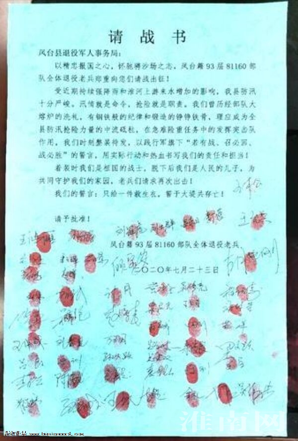 (記者 付莉榮 蘇國義)7月29日,淮河早報、淮南網記者在安徽六和同心風能設備有限公司看到了一份特殊的請戰書,68個手印和68個簽名層層疊疊,十分震撼,這是鳳臺籍93屆某部全體退伍老兵共同發出的出征請戰,也是他們共同按下的赤誠決心,希望能在防汛救災中發揮突擊隊作用。