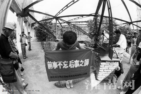 圖二:1997年8月16日,日本友人在淮南大通“萬人坑”前默哀,他們說無論如何低頭認罪都洗刷不了日本的侵略罪行(資料片)
