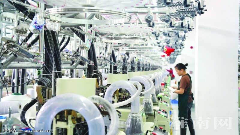 生產車間里,伴隨著一臺臺織造機的高速運轉,一只只編織完成的襪子不時從織造機產品出口“吐”出來,智能化的生產效率讓人欣喜不已。