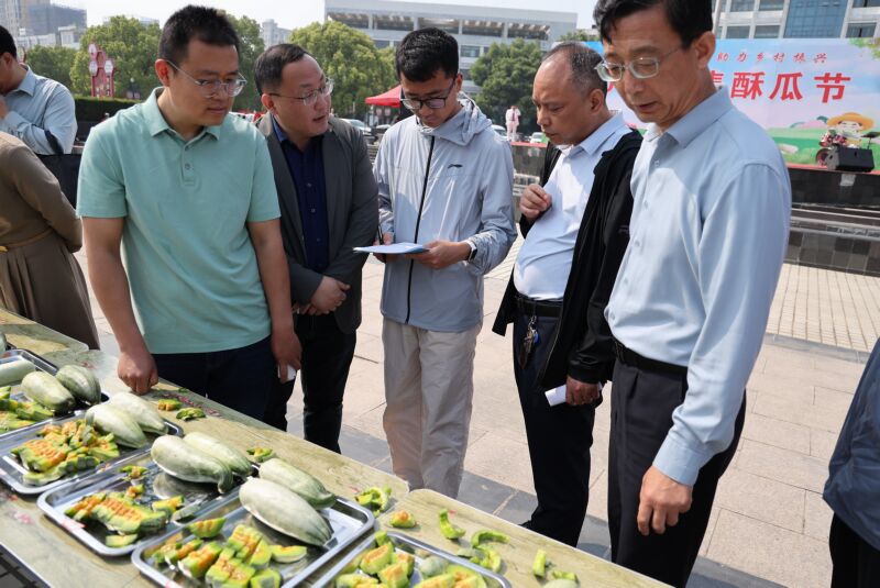 當天,潘集區政府廣場熱鬧非凡。一排長條桌上,30盤標著號碼的酥瓜整齊陳列,清亮飽滿的瓜皮覆著細密絨毛,清甜香氣在空氣中肆意流淌。潘集區蔬菜辦負責人蘇亞與工作人員忙著削皮切瓜,香甜四溢的酥瓜讓他們臉上笑開了花。