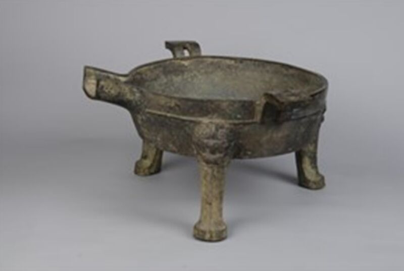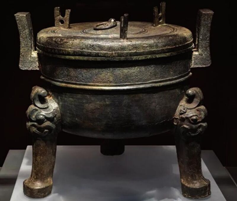楚王熊悍鼎共有兩件,大小與形制相同,分別收藏于中國國家博物館和天津博物館。來自天津的借展之鼎通高55.6厘米,口徑45.5厘米。鼎的腹部微弧,兩側有一對長方形附耳,三只蹄形足,足上端裝飾獸首。器蓋上有一圓環和三個變形的鳥型鈕。腹上部飾細密的渦紋,腹中部飾弦紋。