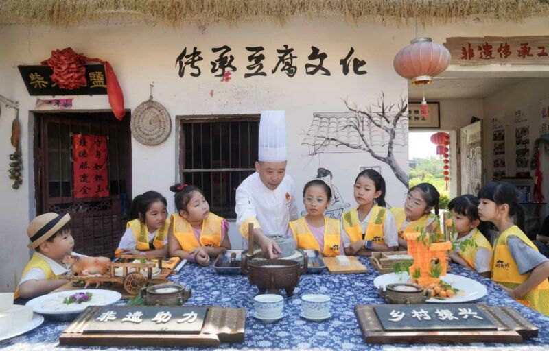 8月22日,在壽縣雙橋鎮大郢村,壽州豆腐宴非遺代表性傳承人張士宏給來研學的小朋友講解豆腐宴傳統制作技藝。
