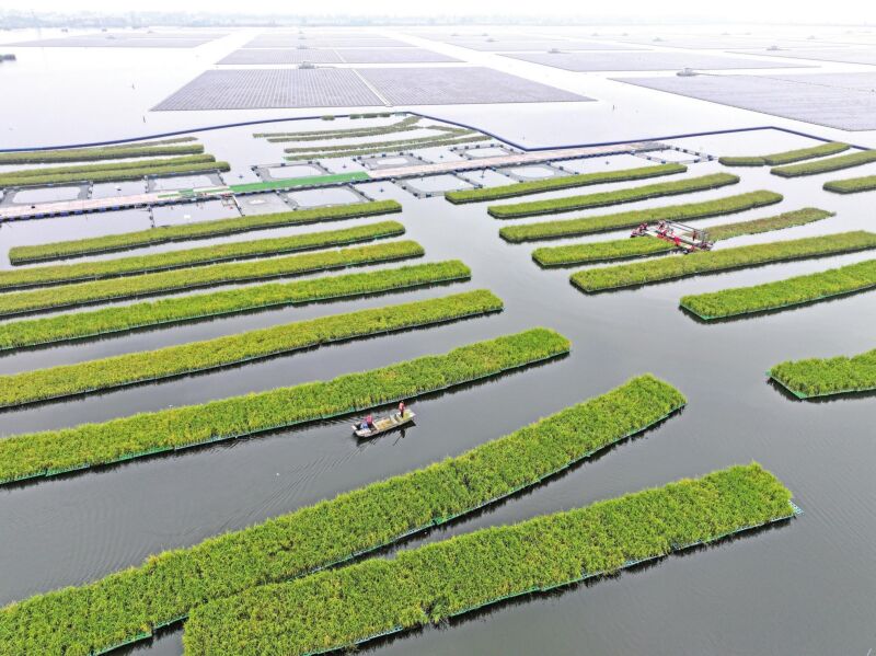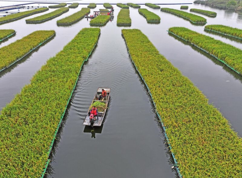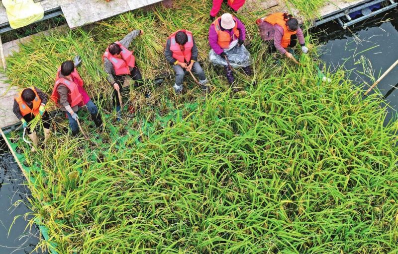 近日,安徽省淮南市鳳臺縣顧橋鎮采煤沉陷區50畝漂浮式水稻迎來豐收。當地積極探索采煤沉陷區綜合治理開發利用,在采煤沉陷區推行水面漂浮水稻種植、水下網箱養魚、水上光伏電站等多種發展模式,科學利用好采煤沉陷區。