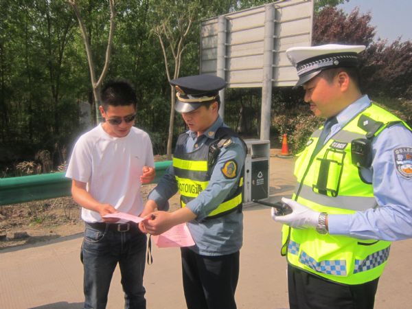 圖:執法人員向在合淮阜高速淮南西出口停車的駕駛員進行宣傳勸離