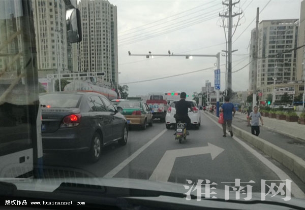 7月27日下午,淮河早報(bào)、淮南網(wǎng)記者從泉山十字路口經(jīng)過(guò)時(shí),看到路口由南向北方向的右轉(zhuǎn)車道上,一名騎電動(dòng)車的人和一名步行的人在右轉(zhuǎn)機(jī)動(dòng)車道上通行,經(jīng)過(guò)的機(jī)動(dòng)車緩慢行駛避讓,而一旁就是非機(jī)動(dòng)車道和人行道。(記者)